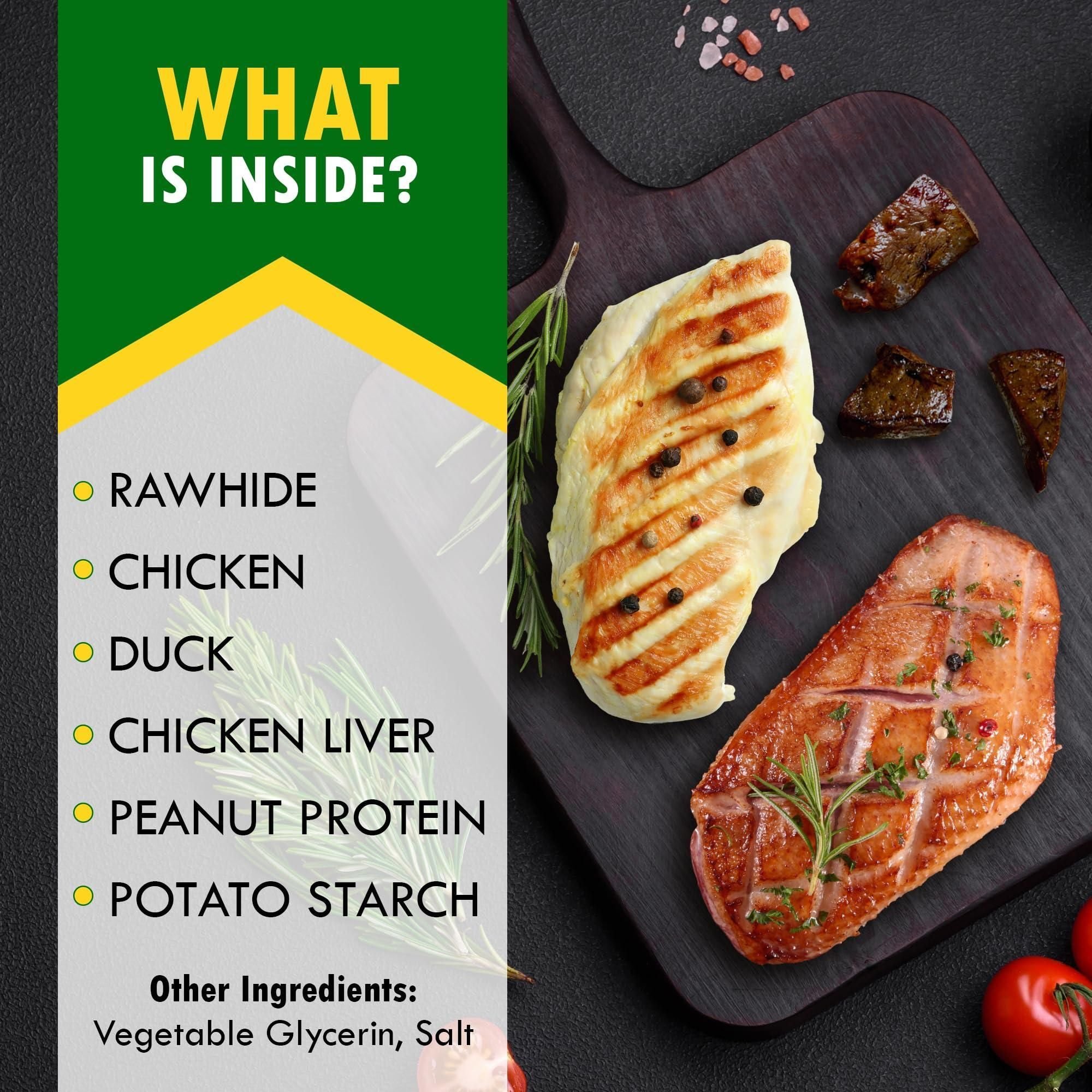 1.premium organic kabob treats: elevate your dog's snacking experience with our gourmet kebab treats, crafted from organic, human-grade ingredients. these rawhide sticks delights with duck, chicken liver are perfect for large and small breed dogs & puppies and aggressive chewers, providing a dental-friendly chew with every savory bite. dental health and gluten-free: promote strong teeth and healthy gums with our dental dog chews. gluten - free and packed with essential nutrients, these chewy