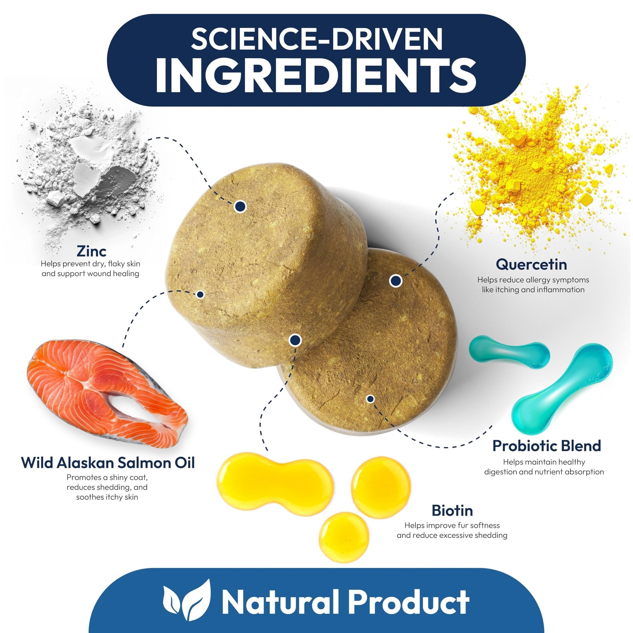 1.promotes healthy skin & coat: our dog fish oil supplements deeply nourish dry, flaky skin while reducing excessive shedding, helping your dog maintain a soft, glossy coat and overall skin health. itch & allergy relief with omega 3 for dogs: made with pure fish oil for dogs skin and coat, these chews help ease itching, redness, and seasonal allergies for healthier skin and comfort. supports hip, joint & heart health: rich in dog omega 3 fish oil, our supplement helps improve