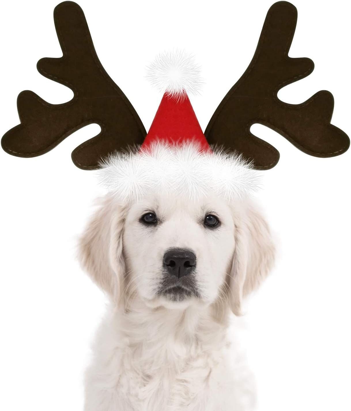 Cute Design: Classic christmas deer hat; with red santa hat and white pompom ball decor design; Let your pet be full of Christmas atmosphere; Elastic band easy on and easy off.