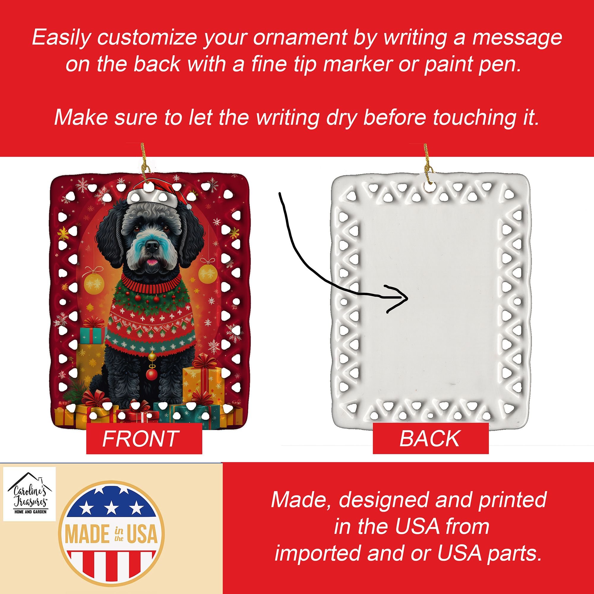 Porcelain Ornament featuring breed specific Portuguese Water Dog artwork. Celebrate Christmas with this Christmas Ornament. Add a unique, personal touch to your holiday decor with our Rectangular Lattice Porcelain Ornament. Perfect for creating cherished memories, this high-quality ornament shines under festive lights, reflecting warmth and joy throughout your Christmas tree. Crafted with a glossy finish, it showcases vibrant, full-color artwork contributed by our talented artists, ensuring your tree is adorned with a burst of color and holiday spirit. What sets this Porcelain Ornament apart is its customizable white back. Use a paint pen or permanent marker to write a heartfelt message, commemorate a special year, or mark an unforgettable date, turning this ornament into a keepsake that will be treasured for years to come. For best results, allow any personalization to dry thoroughly before handling. Each ornament comes complete with a delicate gold cord, making it easy to hang and display. Proudly made in the USA, this ornament measures 3.375 x 2.625 inches and is a thoughtful gift for pet sitters, teachers, family members, or anyone who would appreciate a little extra holiday magic. Bring style, charm, and a touch of personal meaning to your Christmas tree with this beautifully designed ornament..