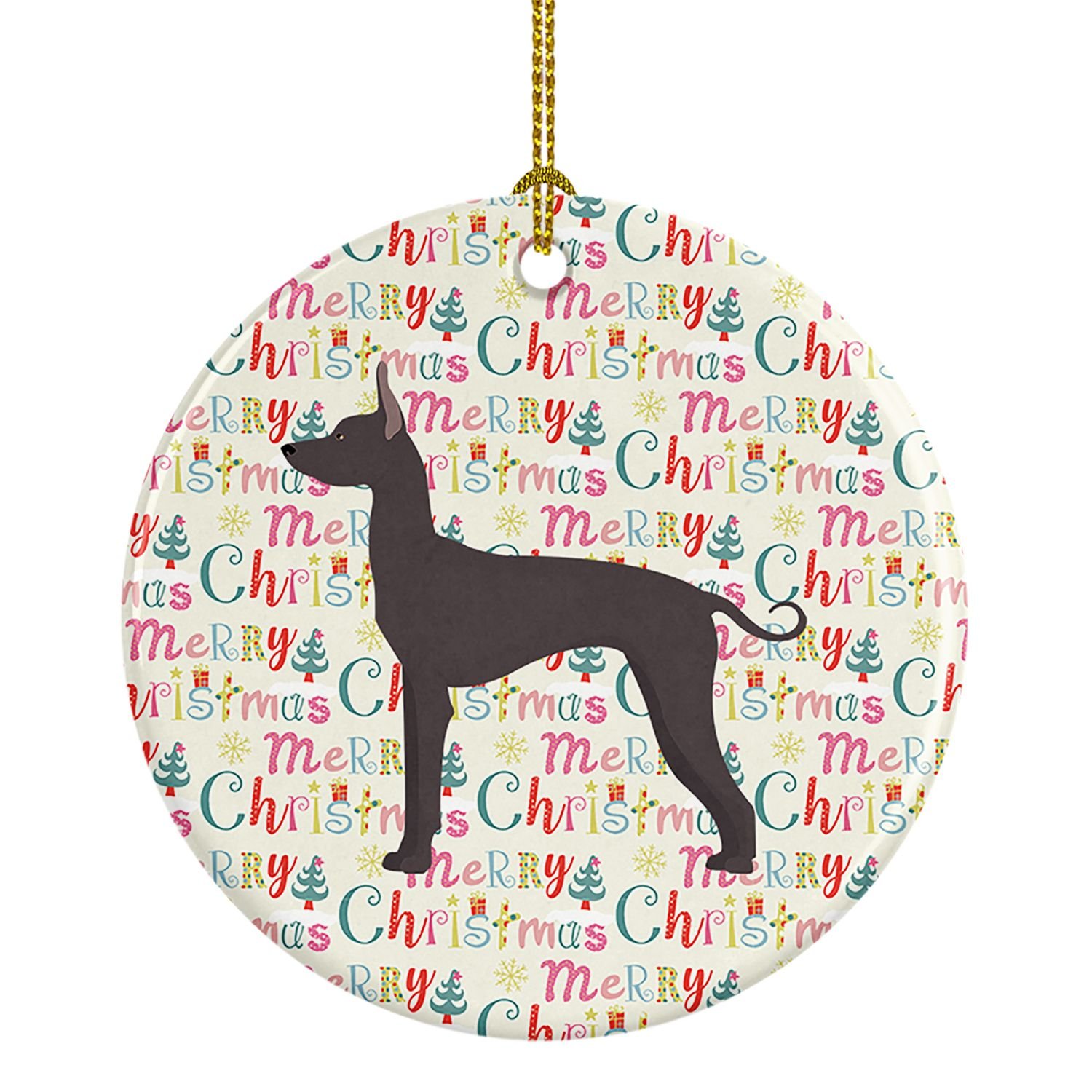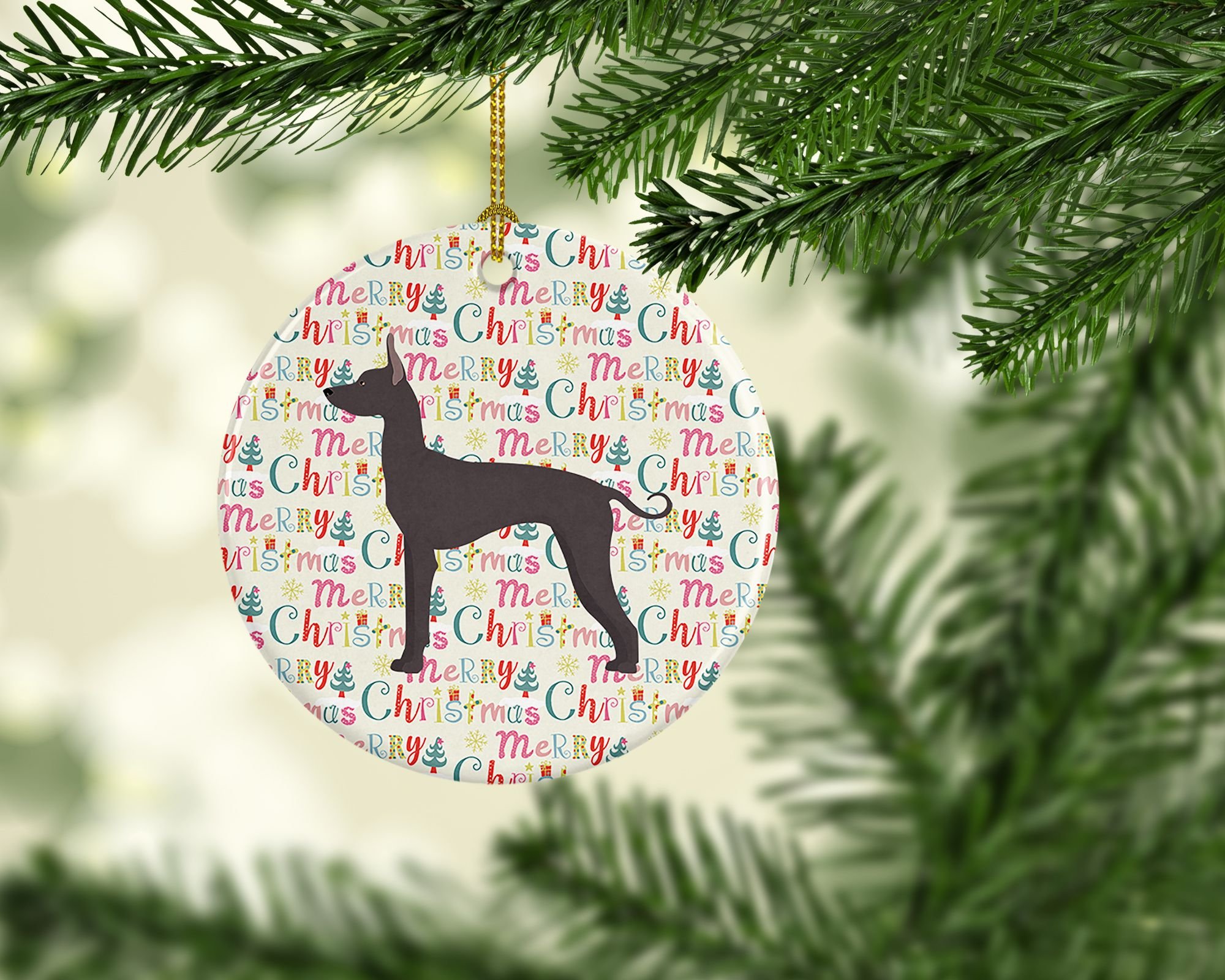 Ceramic Ornament featuring breed specific Mexican Hairless Dog artwork. Celebrate Christmas with this Christmas Ornament. This Ceramic Ornament is from Caroline's Treasures collection Merry Christmas. Add a touch of personalized charm to your Christmas tree this holiday season with our Ceramic Ornament. Measuring 2.8125 inches in diameter, this round porcelain ornament beautifully reflects your festive lights, enhancing your holiday decor. The gloss surface sets off the vibrant, full-color artwork contributed by one of our talented artists, bringing a pop of color and joy to your tree. This Ceramic Ornament doesn't stop at being merely decorative. The white back is designed for personalization. Write a heartfelt message, mark a special year, or inscribe a date with a paint pen or a permanent marker to create a treasured memento. Please ensure you allow any personalization to dry thoroughly before handling to maintain the pristine finish. Included with the ornament is a delicate gold cord for easy hanging. Made in the USA, this Ceramic Ornament makes an exceptional gift for a pet sitter, teacher, family member, or anyone you wish to share a little Christmas magic with. With its blend of style, charm, and personal touch, it's a meaningful addition to any Christmas tree. This Ornament is from Caroline's Treasures Dogs category of products.