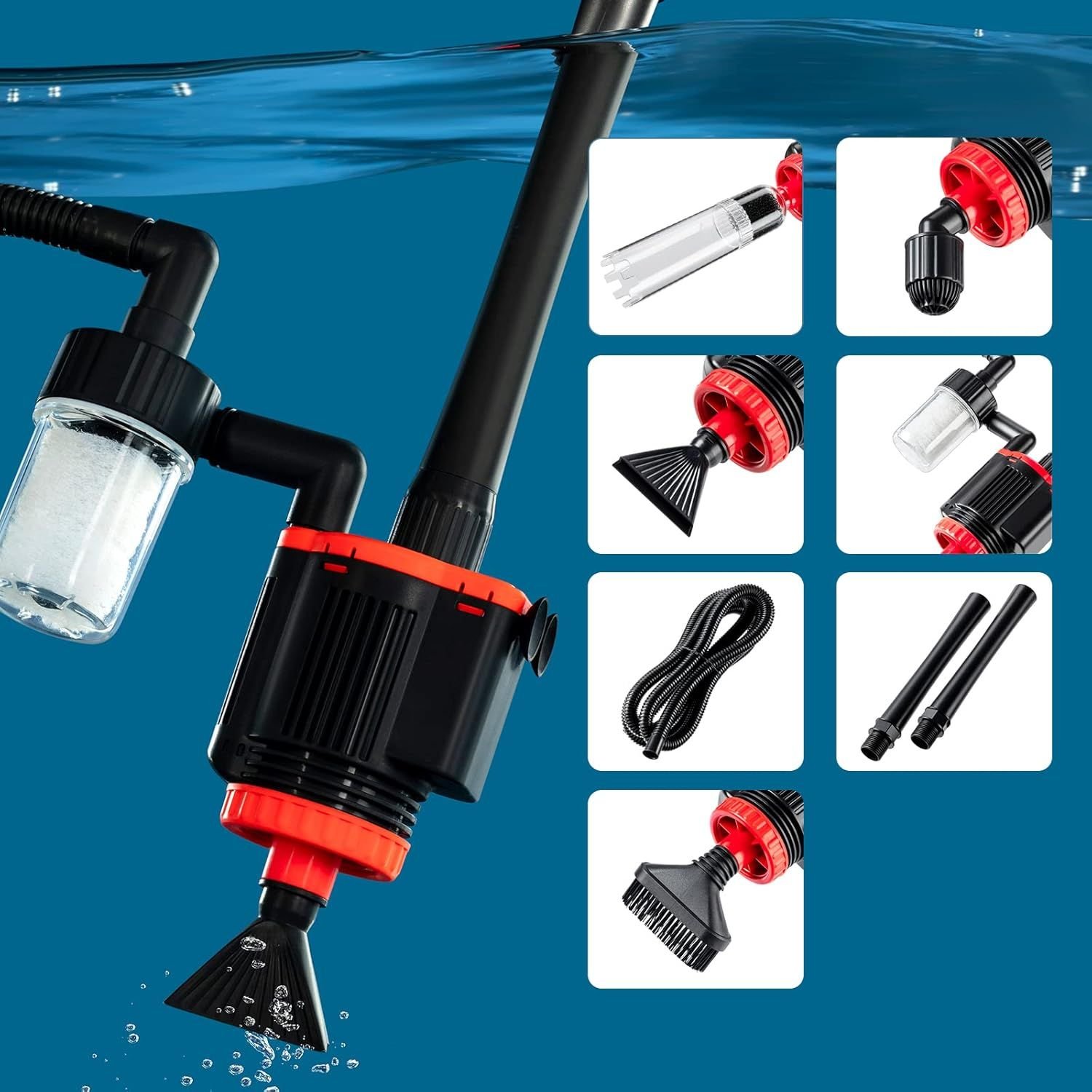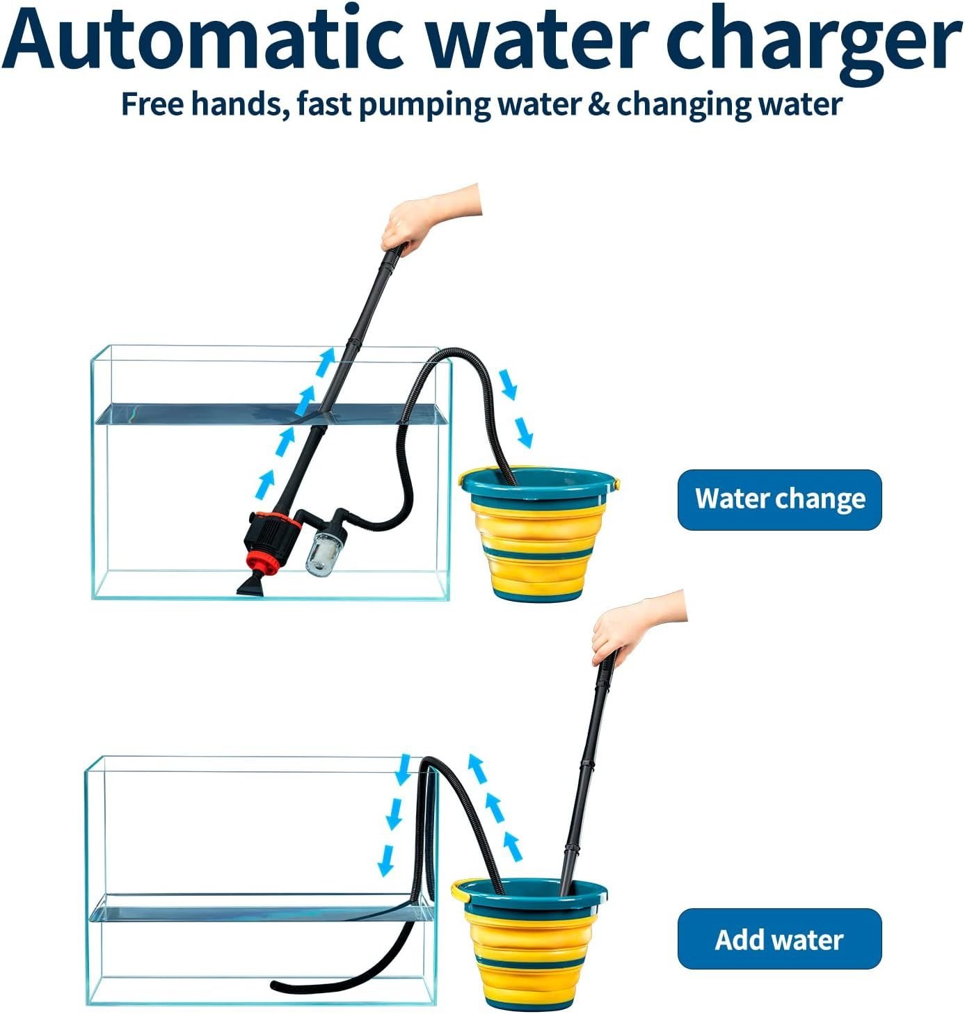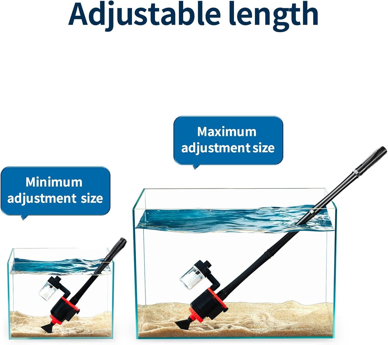 [5 In 1 Multifunction Aquarium Gravel Cleaner]CHERLAM electric water changer supports multi-purpose use and has passed the international UL certification,which has quality assurance.According to different combinations,the accessories can realize 5 functions - water changer + sand washing + debris cleaning + water filter + water flow,suitable for fresh water and sea water and fish tanks of various depths.[Strong Suction] Aquarium cleaner built-in 28w powerful water pump motor can provide a maximum flow of 150GPH. Suction can quickly change water, remove food residue and other debris from fish tank.[Effective Cleaning]Comes with extension tube to adjust handle length according to tank depth.By using sand washing head,it can wash sand and absorb feces.With brush head it can clean the dirt on fish tank bottom.The water changer quickly picks up impurities and debris and leaves them directly in the filter bowl. Filter bowls are easier to clean than filter bags and last longer. The filter cotton can be replaced with other filter materials.[Quick water change] The Hmax has a powerful flow rate of 70inch, 150GPH strong flow can realize fast water change. 1-button electric start pumping, water can be pumped into the bucket, and the extension pipe can also be connected to the drain, saving time and effort. The initial water level can be as low as 2in, no water accumulation, and the pumping can be as low as 0.3in.[High-Quality-After-Sales]Customer satisfaction is our top priority. If you are not satisfied with our aquarium gravel cleaner, please contact us and we will reply to you within 24 hours.It'll be a nice father's day gift for your daddy.